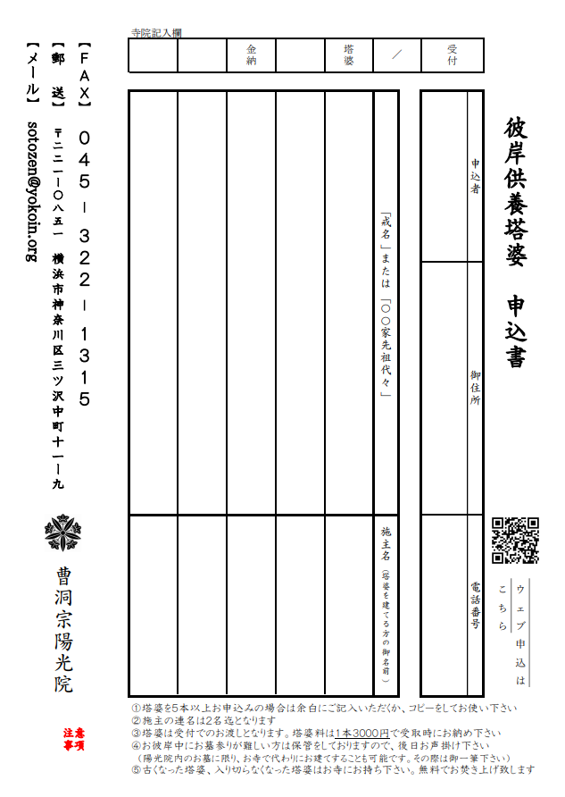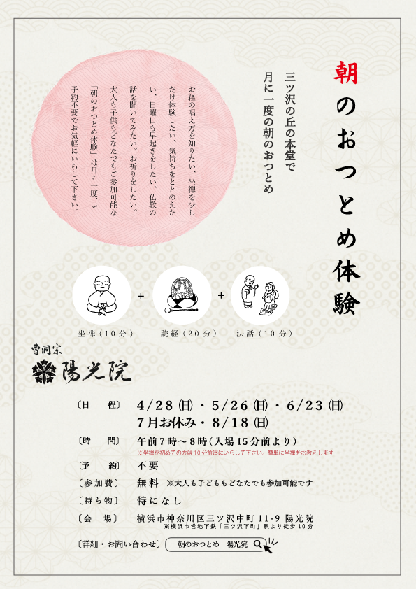 陽光院は約300年の歴史を横浜に刻む、亡き人のご供養を大切にする供養寺です。市営三ツ沢墓地にも隣接し、何万人といえる方々のご供養を重ねて参りました。また、仏の教えを説く禅寺でもあり、修行を重ね、より良く生きる智慧を人々に伝えるお寺でもあります。供養と禅。檀信徒に限らず、地域の方、三ツ沢墓地の方々など、どなたにでもお寺の門を開けておりますので、お気軽にお立ち寄り下さい。