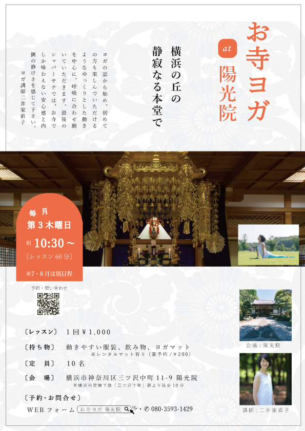 陽光院は約300年の歴史を横浜に刻む、亡き人のご供養を大切にする供養寺です。市営三ツ沢墓地にも隣接し、何万人といえる方々のご供養を重ねて参りました。また、仏の教えを説く禅寺でもあり、修行を重ね、より良く生きる智慧を人々に伝えるお寺でもあります。供養と禅。檀信徒に限らず、地域の方、三ツ沢墓地の方々など、どなたにでもお寺の門を開けておりますので、お気軽にお立ち寄り下さい。