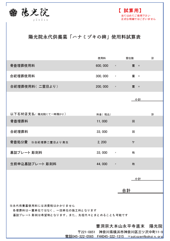 使用料:一霊 30万円 ※2霊目以降は一律20万円