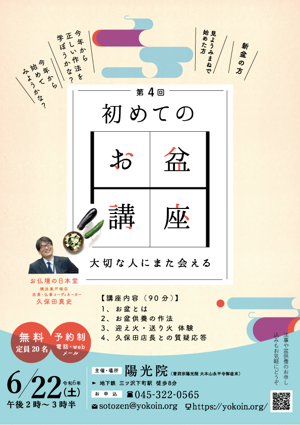 都会を中心に、古来より親から子へ伝わってきたお盆の供養の風習が無くなりつつあります。亡き人をもてなし、ご先祖に感謝を伝える美しいお盆文化を少しでも現代に伝えたく、陽光院ではこの企画を開催しています。