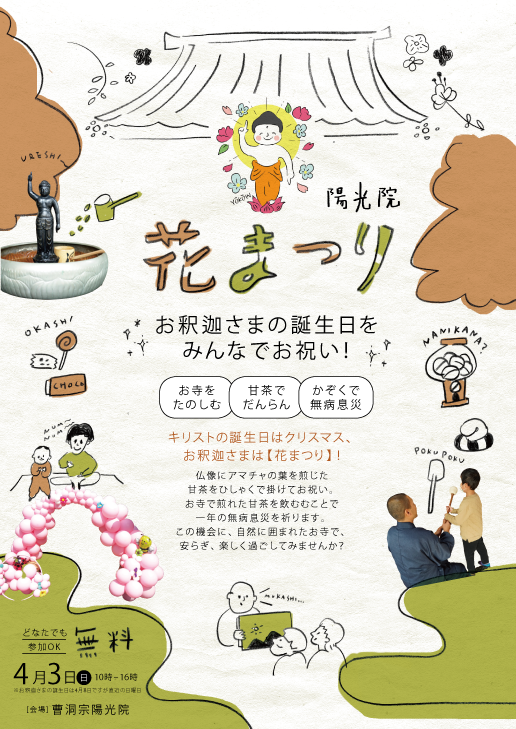 キリストの誕生を祝う日は12月25日で「クリスマス」。お釈迦さまの誕生日は4月8日で「花まつり」と言います。多くのお寺ではこの日にお釈迦さまの誕生を祝う法要や催しを行います。従来、檀家向けとして行うこの行事を陽光院では一般の人、特に子どもたちへお寺や仏教への縁を紡いでもらおうと今年度より大きく門を開いて開催致します。