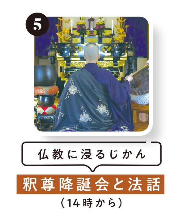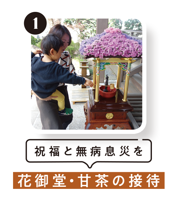 お釈迦さまの誕生を祝う昔から伝わる花御堂をつくり、仏さまに甘茶をかけてお祝いをしてもらいます。詳しいしきたりや作法の意味を書いたパネルも展示。無病息災を祈る甘茶もふるまいます。