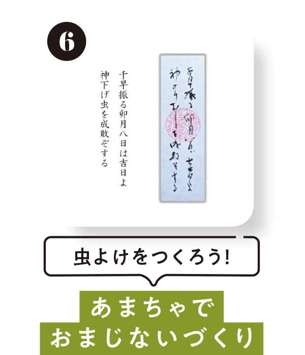 江戸時代、甘茶で摺った墨で「千早振る卯月八日は吉日よ かみさげ虫を成敗ぞする」と紙に書き、それをお手洗いなどに逆さで貼り付けると虫除け(特にごきぶりなど)になると言われていました。これを作るワークショップを開催し、あまり馴染みの無くなった風習をあえて現代に蘇らせます。