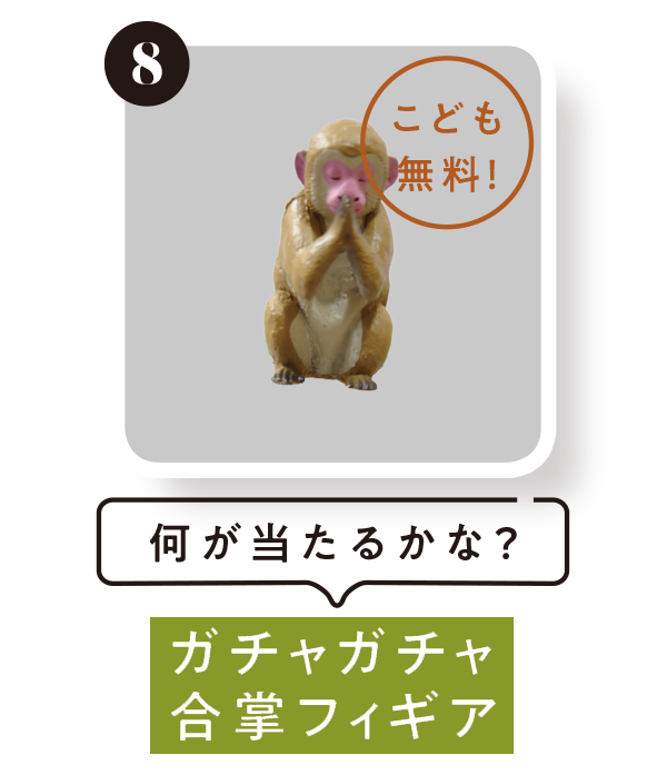 境内にガチャガチャを置き、子どもは無料、大人 100円にて提供。中身は動物が合掌をしたフィギアが入っていて、獲得したフィギアは「仏壇の中に並べています」との声もよく聞き、子どもが仏事に親しむ一因にも繋がっています。