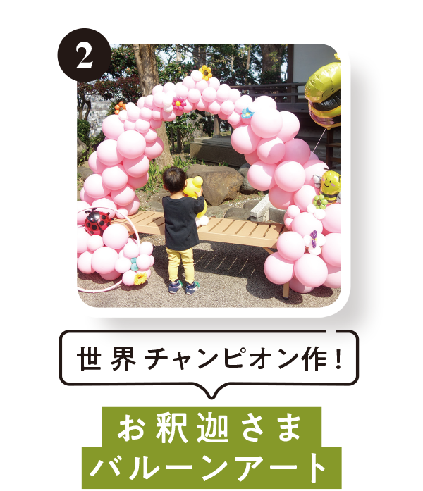 境内にお釈迦さまを模したバルーンアートを展示し、お釈迦さまに親しみと印象を持ってもらいます。今年度の制作者はバルーンアート世界チャンピオンの「シュシュ」さんです!
