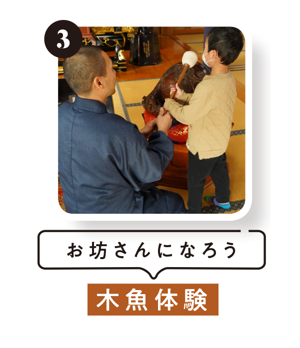 本堂で木魚や鐘を鳴らしてもらうワークショップ。非日常体験を通してお坊さんやお経への興味をもってもらいます。
