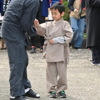 お坊さんの服、作務衣が着れるよ。お坊さんにへんしんして花まつりを楽しもう(子ども用のみ)!