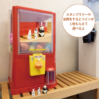 スタンプラリー・坐禅・お坊さんのお仕事体験をした人、お寺クイズツアーの上位者はコイン1枚をゲット。そのコインでガチャをしよう!動物が合掌をしたフィギュアやお菓子・本などが当たるよ!