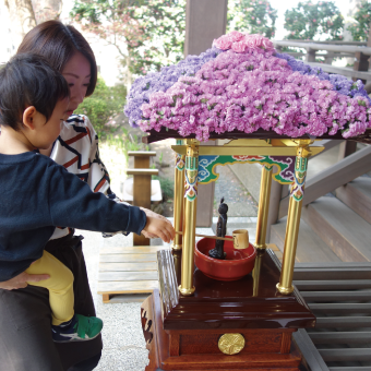 お花で飾ったお堂にいらっしゃるお釈迦さまの仏像に甘茶をかけて、誕生日のお祝いをしよう!