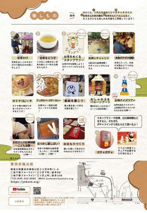 ※当日は駐車場も催し会場となるため、花まつり来場者の駐車場はご用意ありません。近隣コインパーキングのご利用や公共交通機関でお越し下さい(お墓参り者専用の駐車場は別場所に準備しております)。