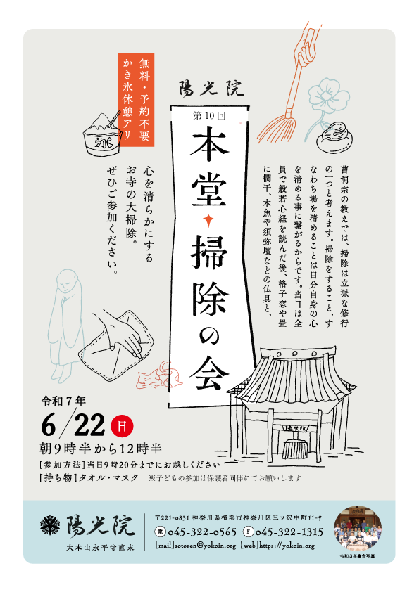 曹洞宗の教えでは、掃除は立派な修行の一つと考えています。掃除をすること、すなわち場を清めることは自分自身の心を清める事に繋がるからです。